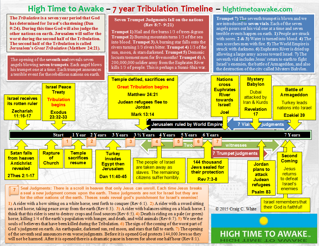 Tribulation TimelineChristians are living in the last days before the terrible time that God pours out his wrath on earth. God will cause many natural disasters and also allow Satan to use a world leader known as the Antichrist to kill millions and to severely oppress Israel. The Church should be warning Israel and the world about the coming Tribulation.