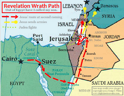 Christ’s second coming is a whirlwind tour! Habakkuk prophesies about Jesus next location. Check out the Revelation Wrath Path map bellow for these bible locations. Remember that the route of the Revelation of Jesus is very similar to the route that Israel took out of Egypt.