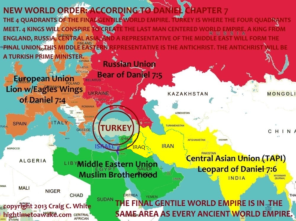 So there are four groups of nations that combine to form one big empire. That’s easy to understand. But wait, I told you earlier that this commentary was about the center of this world empire. Well there is a nation that sits smack in the middle of these four Unions. It is the geographic center of the New World Order. It is also the place where the leader of the next world empire sits today. That nation is Turkey!